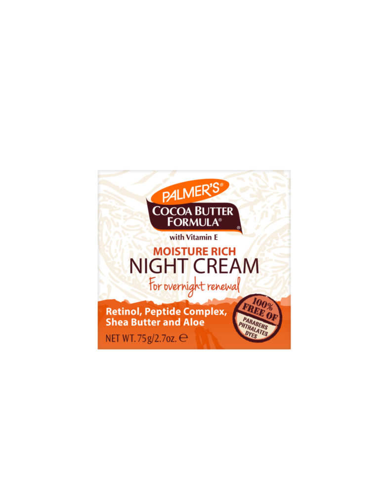 overnight Nightly use leaves skin looking more radiant, youthful and healthy Non-comedogenic Dermatologist Tested Safe for Sensitive Skin Palmer's Cocoa Butter Formula Moisture Rich Night Cream helps skin to regenerate while you sleep. Containing Natural Cocoa Butter, Retinol and antioxidant Vitamin E, this unique formula promotes softer, smoother skin overnight. Nightly use leaves skin looking more radiant, youthful and healthy. |