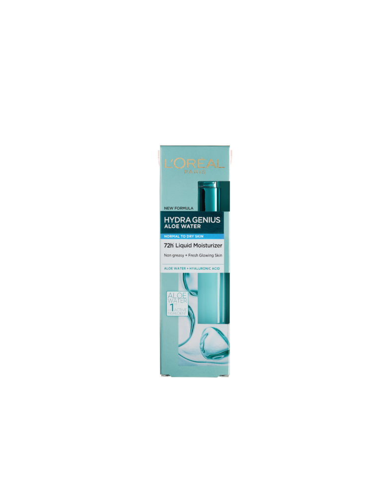 Hydra Genius Aloe Water Face care for dry and normal skin The first daily re-hydrating liquid care, for a fresh and glowing skin Fresh as water and hydrating as a cream Moisturizer with Aloe Water and Hyaluronic Acid A unique water-like texture